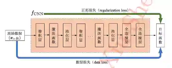 然后再看下方这张长图。第一步,我们先把原始数据输入给它(机器),然后以例如卷积层+池化层+激活函数的组合形式进行卷积操作。之后,再同样采用这种组合形式进行下一组卷积操作……就这样不停循环,直到把所有特征都抽取出来。接着,抽取出来的所有特征与全连接层进行对接,得出预测的值,并与目标值进行对比。最后,机器会对二者的差值进行修复,并重新训练。这是一个完整的工作流程。