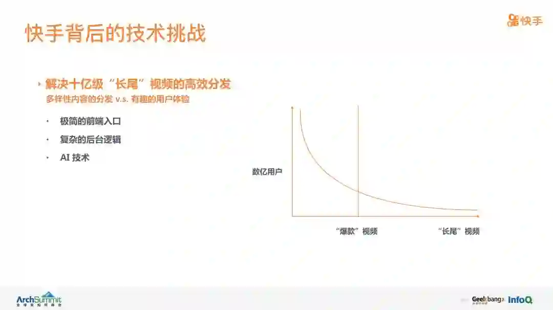 为了解决这个问题,快手采用了独特的技术架构,一是前端入口非常简洁,关注、发现、同城三个 Tab,二是极其复杂的后端架构,通过 AI 和大数据技术实现视频内容理解和个性化推荐,从而解决内容分发的问题。