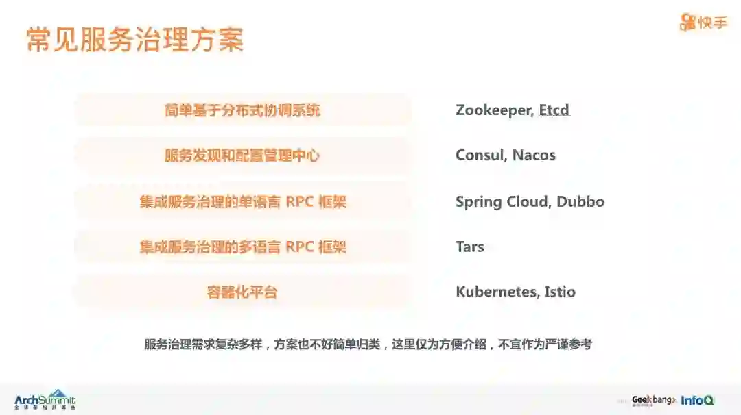 常见的开源方案有很多,为了方便比较,快手把常见的服务治理方案从需求出发做了一个简单的分类。