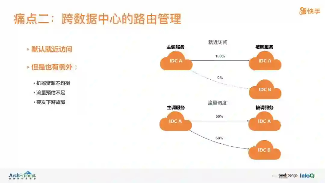 对于多数据中心部署的服务,通常是需要就近访问的,一方面能保证低延迟,另一方面也能减少专线故障对可用性的影响。但也有一些例外,比如说机器资源可能不均衡。在快手,因为业务规模扩张太快,经常出现某个数据中心机器资源紧张的情况。一些服务在特定数据中心没有机器可以部署,就近访问就会失败。另外,在节假日,用户访问量通常会增长,需要提前估算流量安排机器扩容,但估算可能会不足。