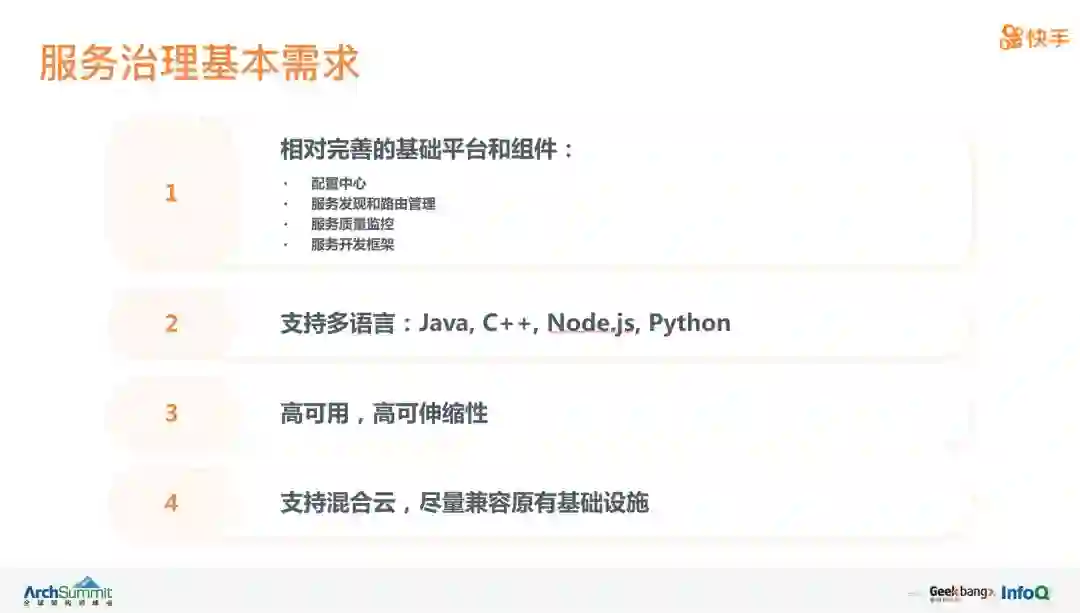 这里列出了服务治理的几个基本要求。首先要有完善的基础平台和组件,包括配置中心,服务发现、监控平台,以及服务开发框架。第二,支持多语言,因为快手的业务特点,主要使用的语言有 Java 和 C++,还有少量业务会使用 Node.js、Python。第三,高可用、高可伸缩性。第四,快手的服务原来主要部署在物理机和虚拟机上,现在又增加了容器化部署平台,需要兼容所有的部署平台。