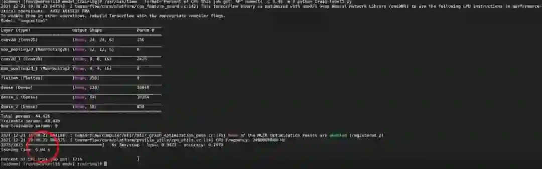 如上图所示,这样的配置看起来训练速度也不是太低,只需要 6 秒就能迭代一个 epoch。这是由于 LeNet-5 模型较小,核多的时候,每个核分配到的计算量过小,导致整体计算效率不高,还不如分配少一点计算核心。