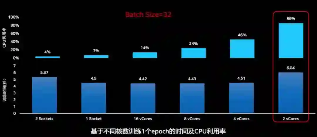 当我们跑完整个不同核心数的测试,就能得到下图关于训练时间、分配核心数、 CPU 利用率三者的关系。当然我们会选择更加经济高效的 2 核心配置。
