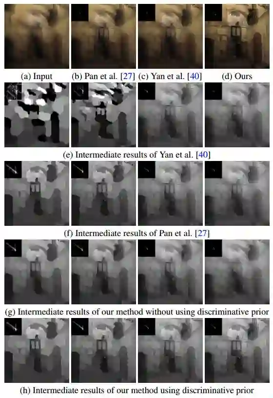 图 12. 去模糊结果和中间结果。作者在图 (a)-(d) 中与目前最先进的方法 [40, 27] 比较了去模糊结果,并在 (e)-(h) 中展示了迭代中的(从左至右)中间隐藏图像。本文的判别先验恢复了用于核估计的具有更强边缘的中间结果。
