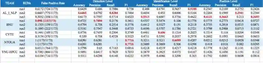 赛题中包含的错误分为四种类型:多词(Redundant)、缺词(Missing)、错词(Selection)和词序错误(Word Order)。系统性能的评估也由易到难分为3个level:detection level(识别句子有没有错误)、identification level(识别错误句子的具体错误类型)和position level(识别错误的位置和对应类型)