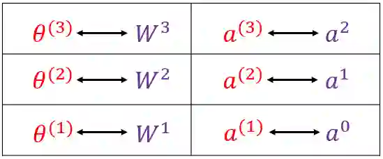 代表目前所计算的第几层, 代表目前计算层中的激活单元的下标,也是下一层的第 个输入变量的下标。 代表下一层中误差单元的下标,是受到权重矩阵中的第 行影响的下一层中的误差单元的下标。验证:吴恩达的这个讲义中关于 BP 推导中只展示出矩阵推导出的结果,略出了中间证明的部分,其中的证明过程可以类比本文中的 section 6 中证明过程,为了能够让验证 BP 推导过程更清楚,我将吴恩达机器学习讲义中的推导符号与本文 section 6 中 4 层含激活函数的神经网络的符号进行类比如下表所示: