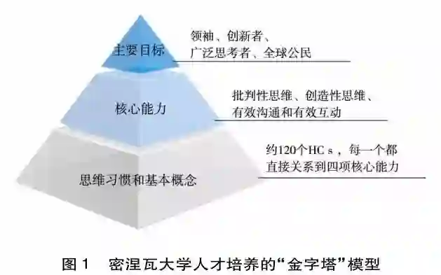 作为一所新型大学,密涅瓦大学孕育于当前知识生产模式II和III的共生环境,跨学科、异质性、多层次、多形态的知识生产要求高校人才培养目标必须与先进的社会生产力和生产关系有效对接。密涅瓦大学围绕“能力本位”的学习目标,构建了人才培养的“金字塔”模型(见图1)。