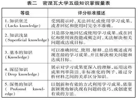 密捏瓦大学围绕其人才培养的“金字塔”模型,根据模型等级结构预设思维习惯与基本概念测度表。测度表涵盖了主要核心课程和专业课程。这些课程的目标是塑造学生的核心能力。课程目标是该大学核心课程、集中课程教学的总目标,通常被分解成2〜5个具体的学习成果,并嵌入特定的技能和知识(Levitt et al.,2017)。为了保证学习成果评价的一致性,密捏瓦大学根据学习成果框架开发了五级知识掌握量表(见表二)。教师对照量表等级及标准评判分数,不仅提高了测评的准确性,还在体现一致性测评框架中分级显示学生的成长表现。