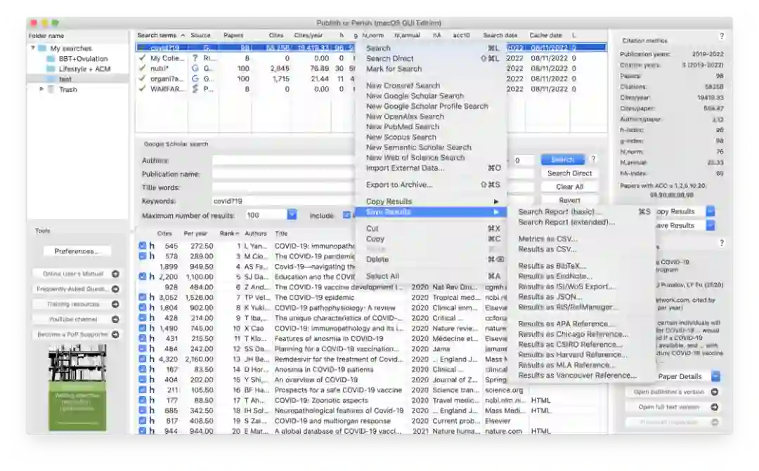 Publish or Perish 是一个文献检索软件,支持包括谷歌学术在内的许多文献数据库,并能在结果中展示文献的引用数、h 因子等指标。PoP 支持导入搜索结果,也可以导出为 CSV、BibTeX、RIS 等格式,方便在其他软件中审阅编辑。