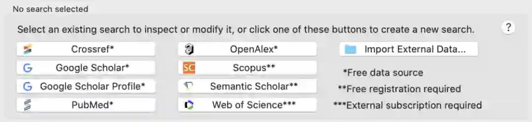 Publish or Perish 主界面最中心的部分就是选择检索文章的来源。它包括了最常用的几个文献库,如 Google Scholar、PubMed、Scopus 及 Web of Science。当然,用户也可以点击「Import」,导入已有的搜索结果。