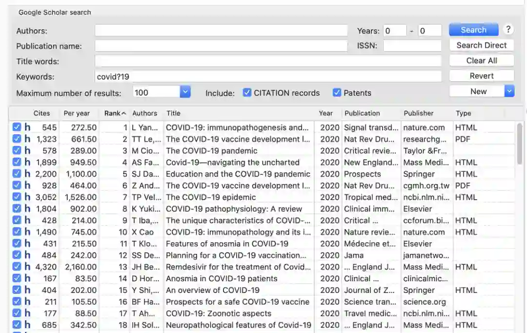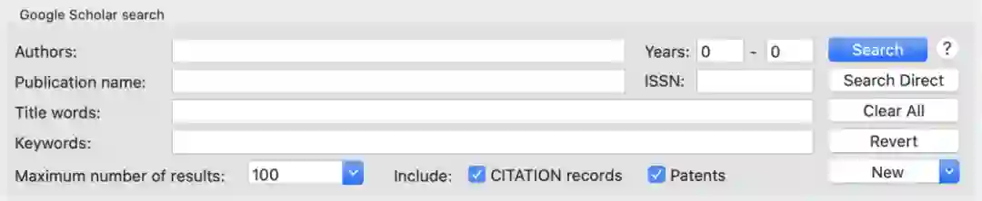 不过,现在 Publish or Perish 只支持手动输入规则,而不能像 PubMed 的高级搜索,用户输入各种规则后自动组合匹配,也无法为搜索结果添加 RSS 或提醒。