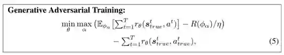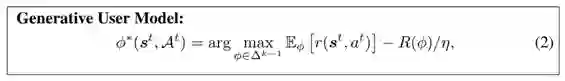 更确切地说,给定某个用户的 T 个观测到的行为的轨迹 {a^1_true, a^2_true, . . . , a^T_true} 及相应的所点击物品的特征 {f^1_∗ , f^2_∗ , . . . , f^T_∗ },研究者通过求解下面的极小化极大优化方法共同学习到用户的行为模型和奖励函数: