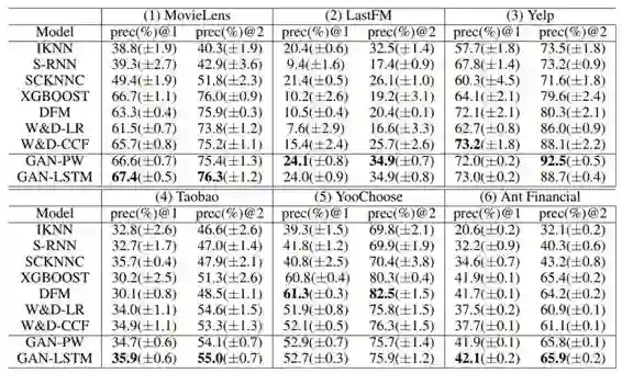 下面展示的是具有位置权重(GAN-PW)和 LSTM(GAN-LSTM)的 GAN 用户模型的预测准确率,表 1 结果表明 GAN 模型的性能显著优于基线。此外,GAN-PW 的性能几乎和 GAN-LSTM 一样,但训练效率更高。因此后续实验使用的是 GAN-PW(后面统称 GAN)。
