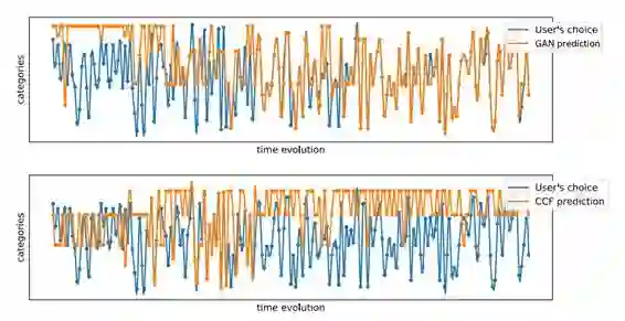 另一个在 Movielens 上得到的结果很有趣,如图 3 所示。蓝色曲线表示用户随时间推移的实际选择。橙色曲线则是 GAN 和 W&D-CCF 预测的行为轨迹。