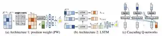 图 2:由 (a) 位置权重 (PW) 或 (b) LSTM 参数化的模型架构。(c) 级联 Q 网络。