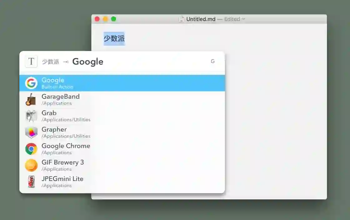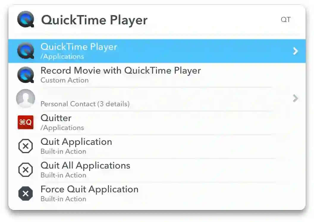 LaunchBar 是一款 macOS 上的启动器应用,它可以用来实现很多功能,比如最简单的快速启动应用,激活 LaunchBar 后,输入 qt,再敲下回车,就能立刻打开藏在文件夹深处的 QuickTime Player。