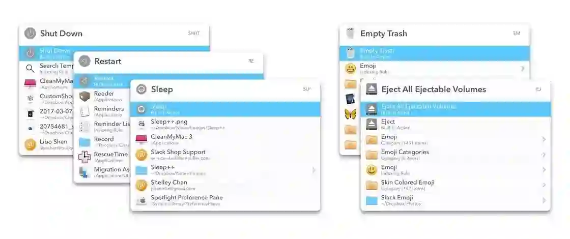 LaunchBar 还能用来快速执行系统动作,比如用来快速关机、重启、睡眠、清空废纸篓、弹出 U 盘。