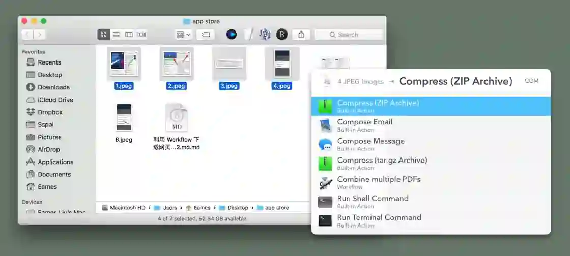 Instant Send 也可以作用在文件上,同样是选中文件后,激活 Instant Send,可以进行移动文件、打包压缩、用特定 App 打开等操作。