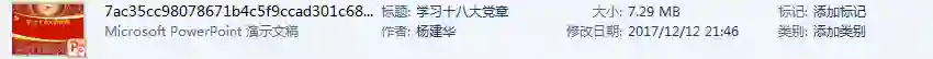 该漏洞文档是一个关于十九大的PPT,其最后修改时间为2017年12月12日。根据文档文件中的元数据,可以推测攻击者从网上检索到了“杨建华”制作的学习十八大党章的PPT文档,由名字为"steusr"的用户最后修改该文档内容制作为诱导文档。