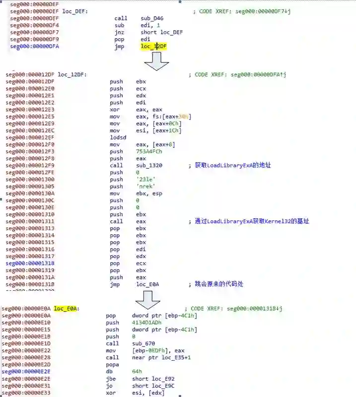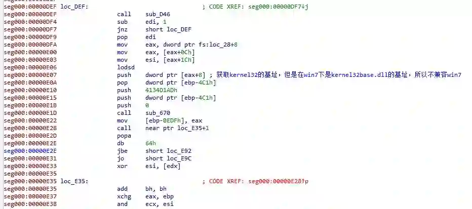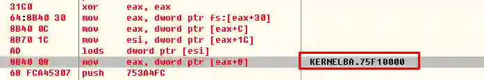 由于Poison Ivy已经停止更新,所以攻击团伙为了使shellcode能够执行在后续版本的Windows系统,其采用了代码Patch对获取kernel32基址的代码做了改进。