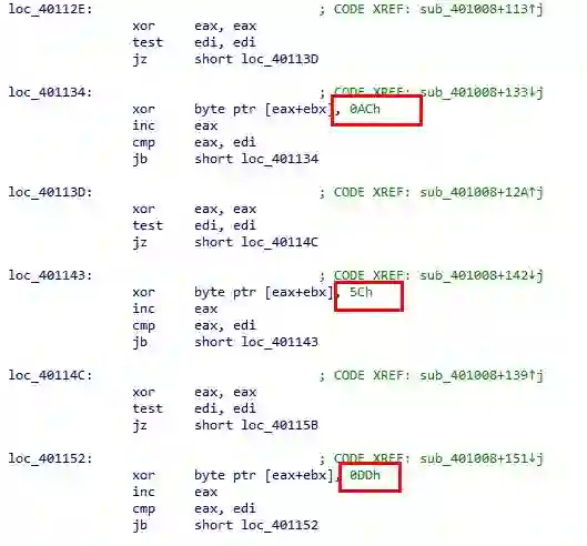 分发域名地址托管的.tmp文件均为逐字节异或的shellcode,如下图为从分发域名下载的tinyq1detvghrt.tmp文件,该文件是和0x2d异或加密的数据。