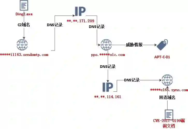 1.使用鱼叉邮件投放漏洞文档,其用于下载执行恶意的HTA文件; 2.使用PowerShell下载执行第一阶段载荷; 3.修改Poison Ivy生成的shellcode作为命令控制模块; 4.使用动态域名进行命令控制,并且子域名通常伪装成Office,系统更新,163邮箱和招聘网相关内容; |