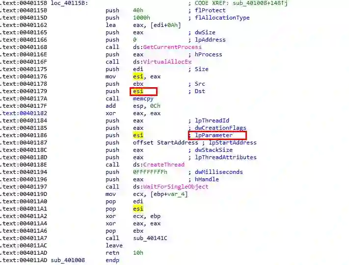 之后把解密完的shellcode在新创建的线程中执行,如图: