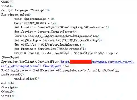 并且进一步下载恶意的HTA文件,其执行PowerShell指令下载Loader程序,保存为officeupdate.exe并执行。