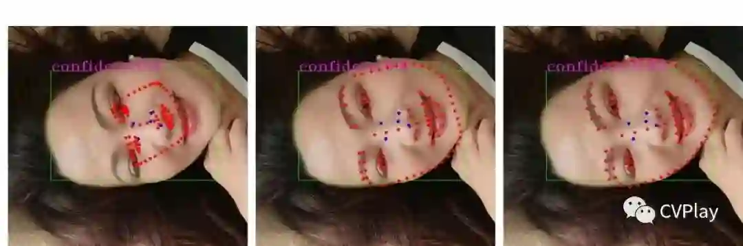 下面我们结合各路资料简单谈谈人脸关键点算法的自研,首先我们上一张极端图,以此引发算法设计的思考:图中蓝色为人脸检测器的五点,红色依次是模型的输出,左图基于人脸检测器五点做人脸对齐,中图基于左图的模型输出做人脸对齐,右图基于中图的模型输出做人脸对齐,三次精调救回极端case,证明人脸对齐对人脸关键点的回归作用很大。