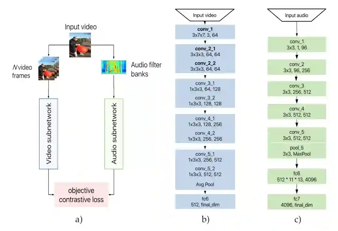 由上图 (a) 所示,AVTS 模型采取的是双流结构,一路是视频特征提取网络,一路是音频特征提取网络,对提取得到的特征利用对比度损失进行优化。
