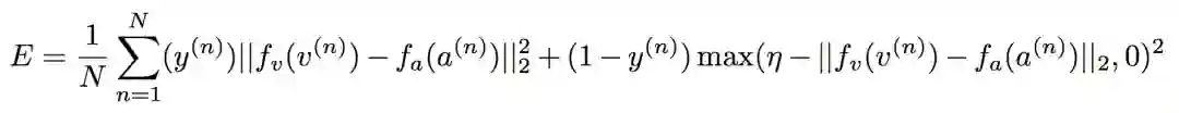 优化 AVTS 模型中,论文作者一开始直接采用交叉熵损失进行优化,发现从头开始学习时很难在这种损失下实现模态间的融合,通过最小化对比度损失可以获得更一致和稳健的优化,在正对上产生小距离,在负对上产生更大距离: