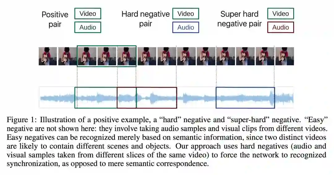 训练集选择同一视频下时序对应的视频和音频为同步的正例,对于负例,定义不同视频下视频和音频为简单负例,同一视频下时序不同步的为硬(“hard”)负例,硬负例下时序相差太远的定义为超硬负例,我们由下图可以进一步理解正负例定义原则。