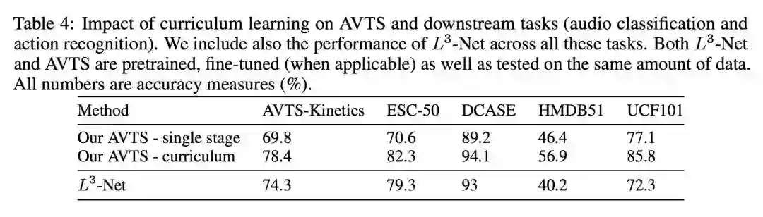 在评估视觉特征性能时,正如预期的那样,使用动作类标签对 Kinetics 数据集进行预训练可以提高 UCF101 和 HDMB51 的准确度。但是,这会占用 500K 视频剪辑上手动标记的巨大成本。相反,AVTS 预训练是自监督的,因此它可以应用于更大的数据集而无需额外的人工成本。