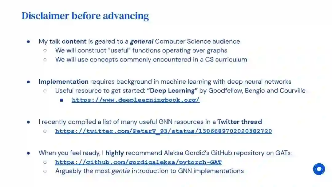 这次演讲的目标听众是一般的计算机科学听众,不过一些关于机器学习的神经网络的基本知识也会很有用。我也希望经验丰富的GNN从业人员可以从我将呈现的分类中受益。