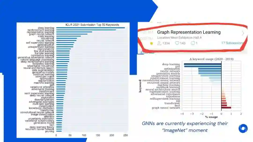 近年来,对图表示学习的研究激增,包括深度图嵌入技术、将CNNs泛化为为图结构数据和神经消息传递方法。图形神经网络(GNNs)和相关技术的发展已经在许多领域带来了最新的研究成果:化学合成、车辆路由、3d视觉、推荐系统、问答、连续控制、自动驾驶和社交网络分析。因此,在几乎所有顶级机器学习会议上,GNNs经常在增长最快的趋势和研讨会上名列前茅。