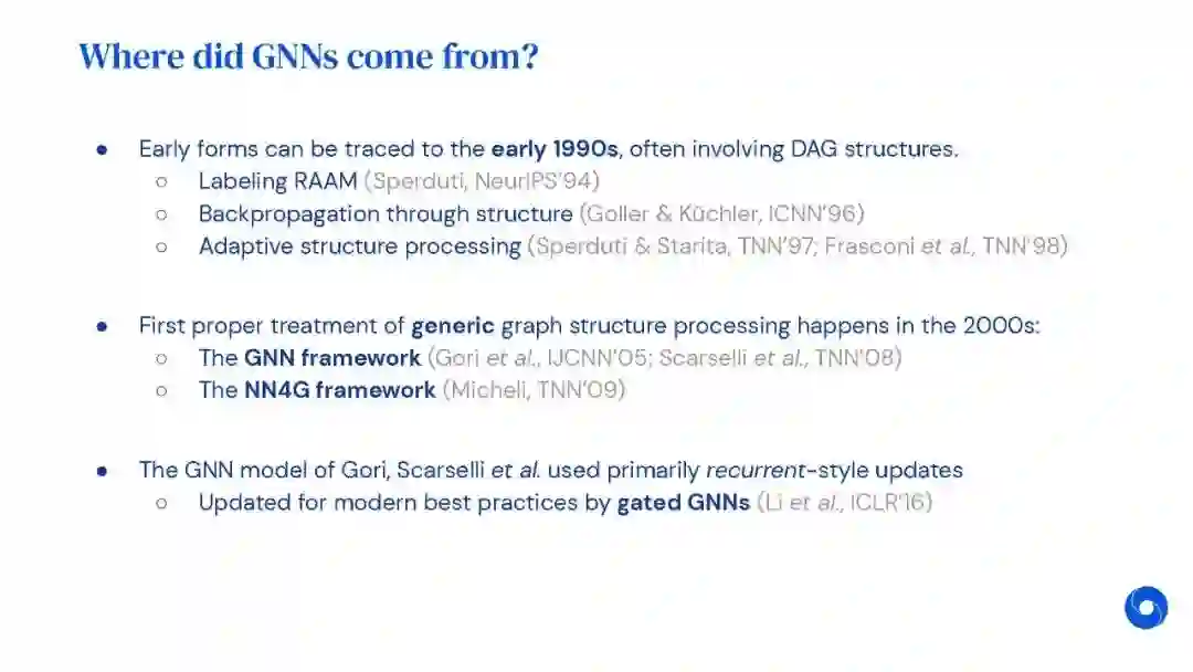 但是,什么是GNN呢? 快速在线搜索可以发现许多不同的定义。根据作者所假设的背景,这些定义可能大相径庭(甚至使用完全不同的术语)。这并非巧合:我们现在所认为的图神经网络的概念,都是在过去十年里从各种机器学习方向独立出现的。