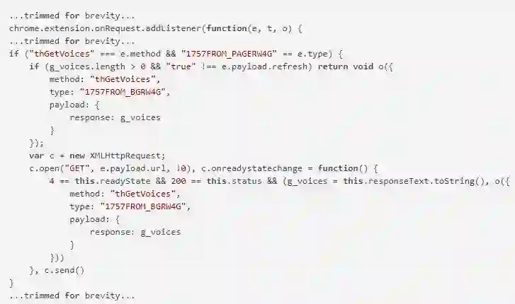 上述代码显示,“chrome.extension.onRequest” .addListener监听器被触发时,其内部的“method” 参数会被设置成“thGetVoices”,“type”参数则被设置为“1757FROM_PAGERW4G”。如果这个触发事件中的“payload.refresh”参数为“true” ,则其中的XMLHTTPRequest会被请求响应为代号为200的状态码。