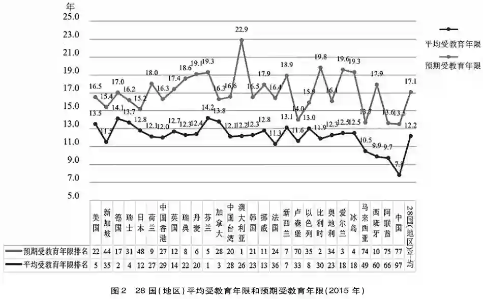 国民受教育程度与技能水平紧密相关。OECD的调查数据表明,教育和技能是就业能力的关键。高中学历通常被认为是成功进入劳动力市场和持续就业的最低要求。受教育程度高的人技能水平更高,教育能确保技能的持续性发展(OECD,2015a)。数据显示,我国25岁以上人口的受教育年限和适龄儿童的预期受教育年限显著低于其他27国(地区),重要原因之一在于义务教育年限低于其他国家。