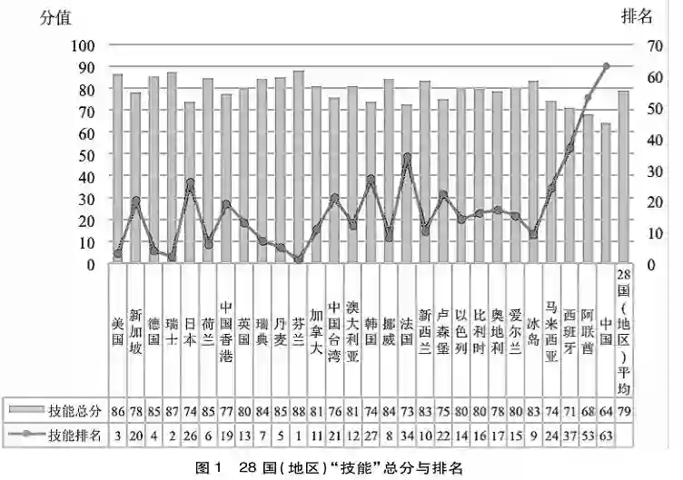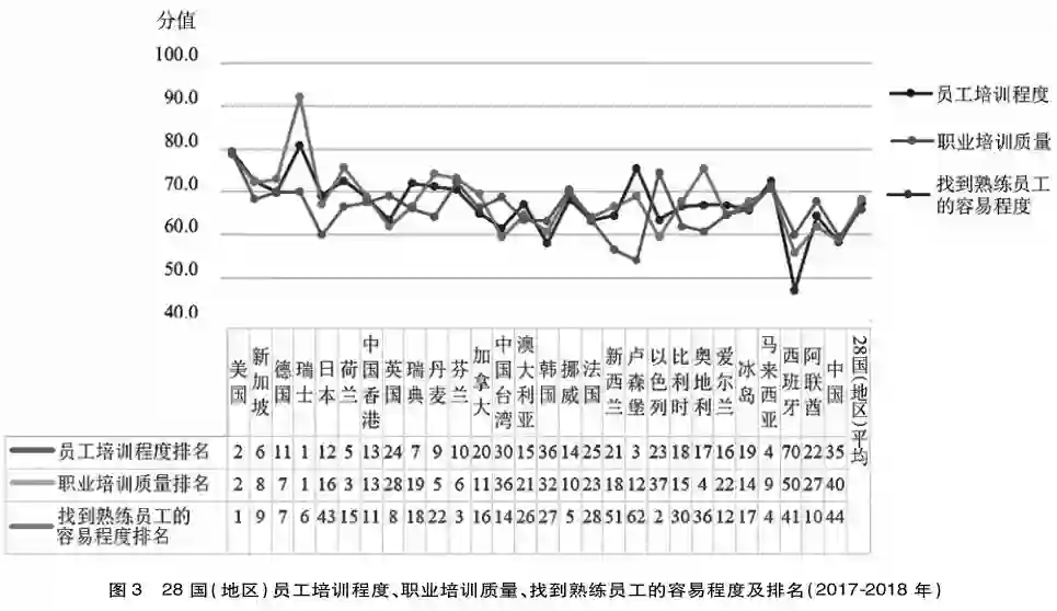 与其他指标相比,员工培训程度、职业培训质量、找到熟练员工的容易程度整体表现欠佳,28国(地区)三项指标平均值均低于70分,表明大多数国家(除瑞士、美国外)对劳动力的再教育和再培训相对缺乏,毕业生技能难以满足企业需求,教育与市场需求存在一定程度脱节。而我国这三项指标的得分均低于60分,与大多数国家差距较大,表明在这三方面面临更大挑战。