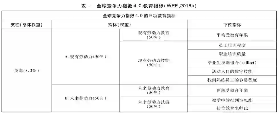 构成全球竞争力的12个支柱息息相关,“技能”支柱主要衡量人力资本,是支撑全球竞争力的核心支柱之一。技能与教育相关,“技能”支柱涉及9项教育指标,占竞争力权重的8.3%(见表一)。