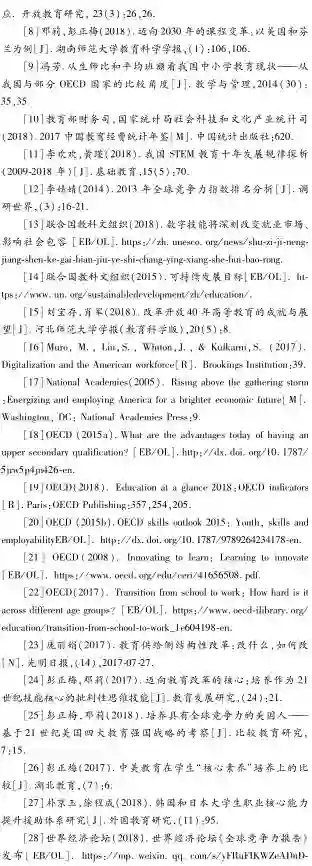 2018年世界经济论坛用于评判全球竞争力的支柱和指标的变化正反映了对高阶技能的重视,这与世界多国正在推动的21世纪技能教育改革运动及世界银行、OECD等国际组织的关切一致,即除了3R(Reading,wRiting,aRithmetic,即读写算)基本技會旨,具备4C(Critical thinking and problem solving,Communication,Collaboration,Creativity and innovation,即批判性思维和问题解决、交流、合作、创造力和创新)技能、数字技能、适应能力等高阶技能的高级人力资本愈发重要(邓莉等,2017b)。世界银行2018年发布的《2019年世界发展报告》也提出人力资本投资迫在眉睫,领导力、团队合作能力、创造力等软实力尤为重要(世界银行,2018)。