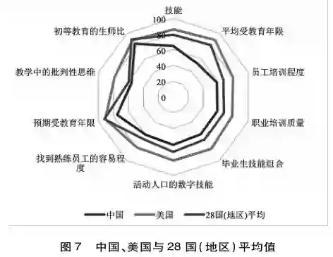 中国参与全球竞争,实际上主要是与美国之间的竞争。美国劳动力的总体技能水平和9项教育指标都居140个经济体前列。除初等教育生师比、预期受教育年限指标,美国的得分稍低于28国(地区)平均值外,其他7项指标明显高于28国(地区)平均值(见图7)。中国除了“教学中的批判性思维”“初等教育生师比”指标与28国(地区)平均值差距不大外,其他指标明显低于28国(地区)平均值。中国除“初等教育生师比”指标与美国相差不大外,其他8项指标和总体技能水平显著低于美国,通常低20分以上。可见,中国现有劳动力和未来劳动力技能水平在各项教育指标上与美国存在较大差距。