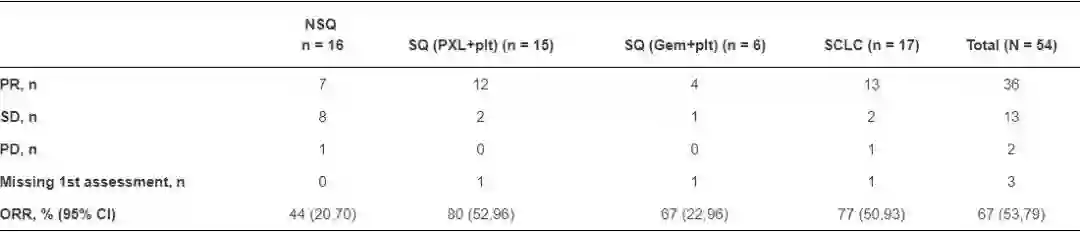 截止2018年10月15日,54例患者中仍有24例在接受治疗。36例患者疗效评价为部分缓解,所有患者的客观缓解率为67%,无进展生存(PFS)数据尚未成熟。研究表明替雷利珠单抗联合含铂化疗方案治疗晚期肺癌患者耐受性良好,显示出抗肿瘤活性(临床试验信息:NCT03432598)。