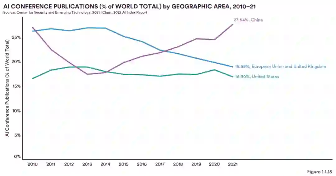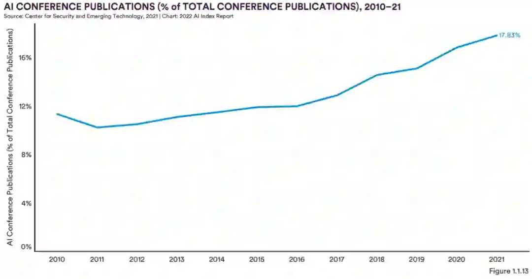 AI 会议出版物数量在 2019 年达到峰值,比 2021 年的峰值下降了约 19.4%(图 1.1.12)。然而,尽管总数有所下降,但自 2010 年以来,人工智能会议出版物在全球会议出版物总数中的份额增加了超过 5 个百分点(图 1.1.13)。
