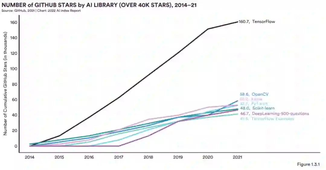 图 1.3.1 和 1.3.2 反映了 2015 年至 2021 年 GitHub 开源 AI 软件库的用户数量。TensorFlow 仍然是 2021 年迄今为止最受欢迎的,GitHub 累计 star 量约为 161,000 ,比 2020 年略有增加。TensorFlow 在 2021 年,它的受欢迎程度大约是排名第二的 GitHub 开源 AI 软件库 OpenCV 的三倍,紧随其后的是 Keras、PyTorch 和 Scikit-learn。图 1.3.2 显示了 GitHub star 量少于 40,000 的库的受欢迎程度—— FaceSwap 位居榜首,其次是 100-Days-Of-ML-Code、AiLearning 和 BVLC/caffe。