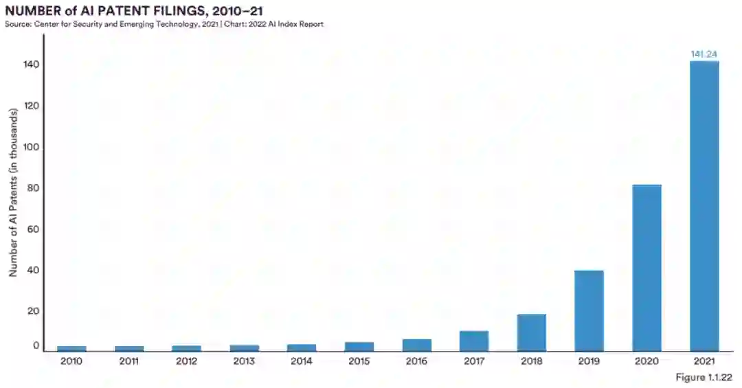 图 1.1.22 为 2010 年到 2021 年 AI 专利申请数量。2021 年 AI 专利申请量是 2015 年的 30 倍以上,复合年增长率为 76.9%。