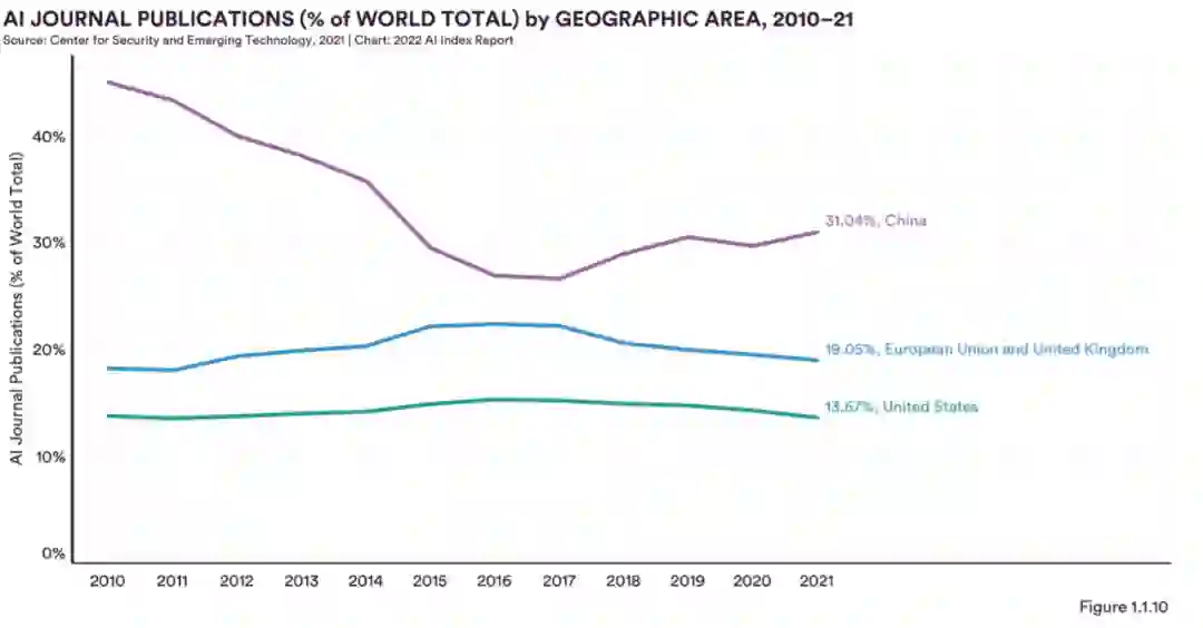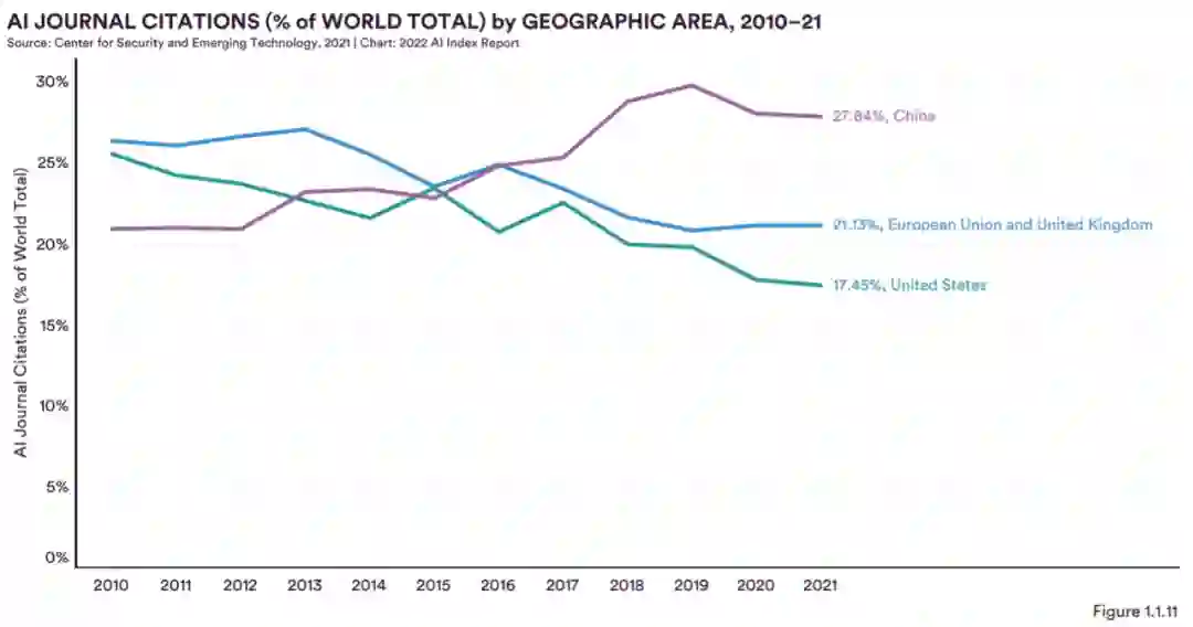 引用次数:在 AI 期刊论文的引用次数上,中国的份额逐渐增加,而欧盟以及英国和美国的份额则在下降。这三个地理区域的总引用量占全球总引用量的 66% 以上。