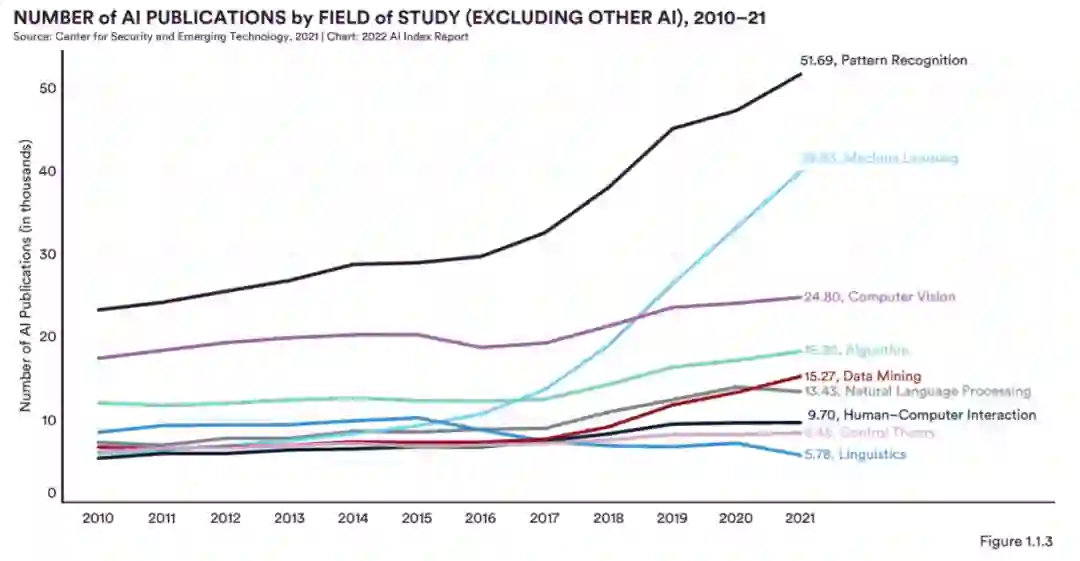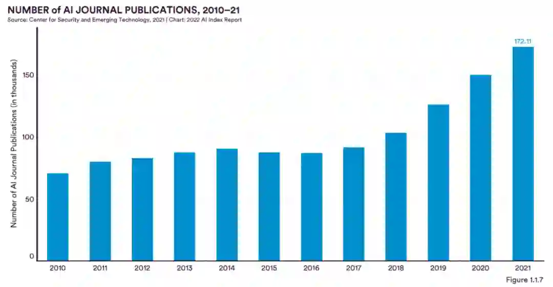 在从 2010 年到 2015 年仅略有增长之后,AI 期刊出版物的数量自 2015 年以来增长了近 2.5 倍(图 1.1.7)。