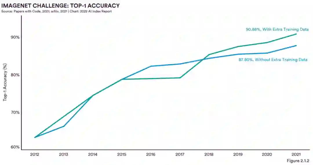 截至 2021 年底,顶级图像分类系统 Top-1 准确率上平均每 10 次分类出现 1 个错误,而在 2012 年底,平均每 10 次分类出现 4 个错误。